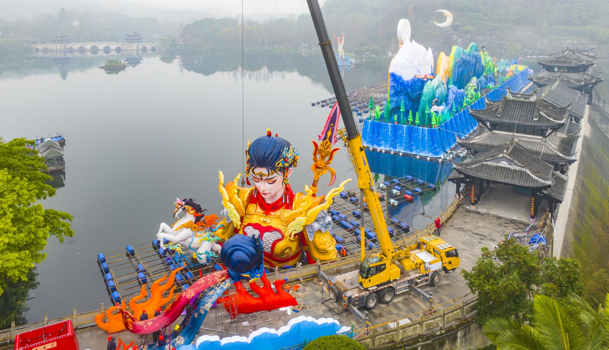 ▲2026重庆市新春灯会——“禧欢霓”园博园大型水上灯会,工人们正在抓紧搭建《巾帼良玉》灯组。记者 齐岚森 摄/视觉重庆