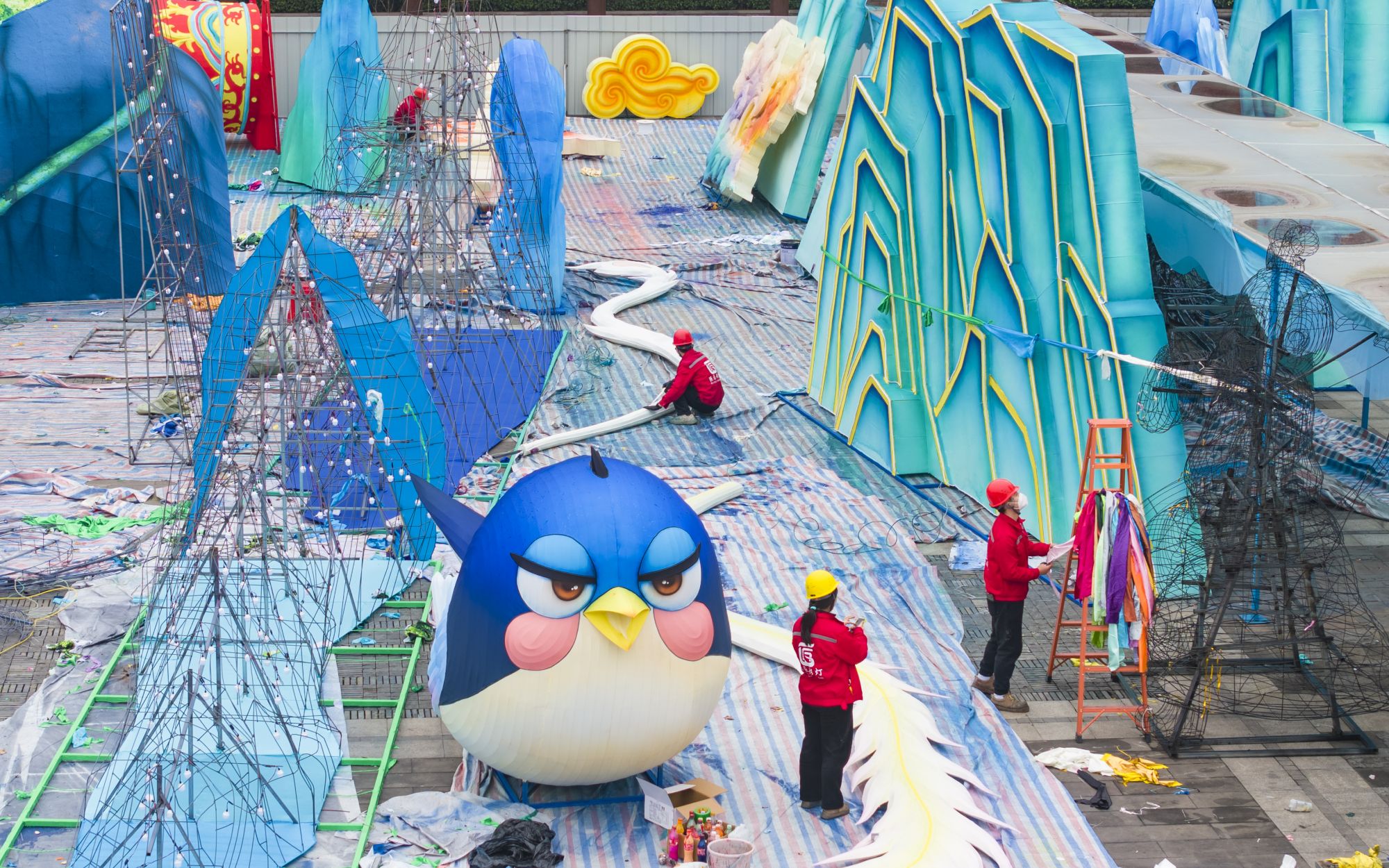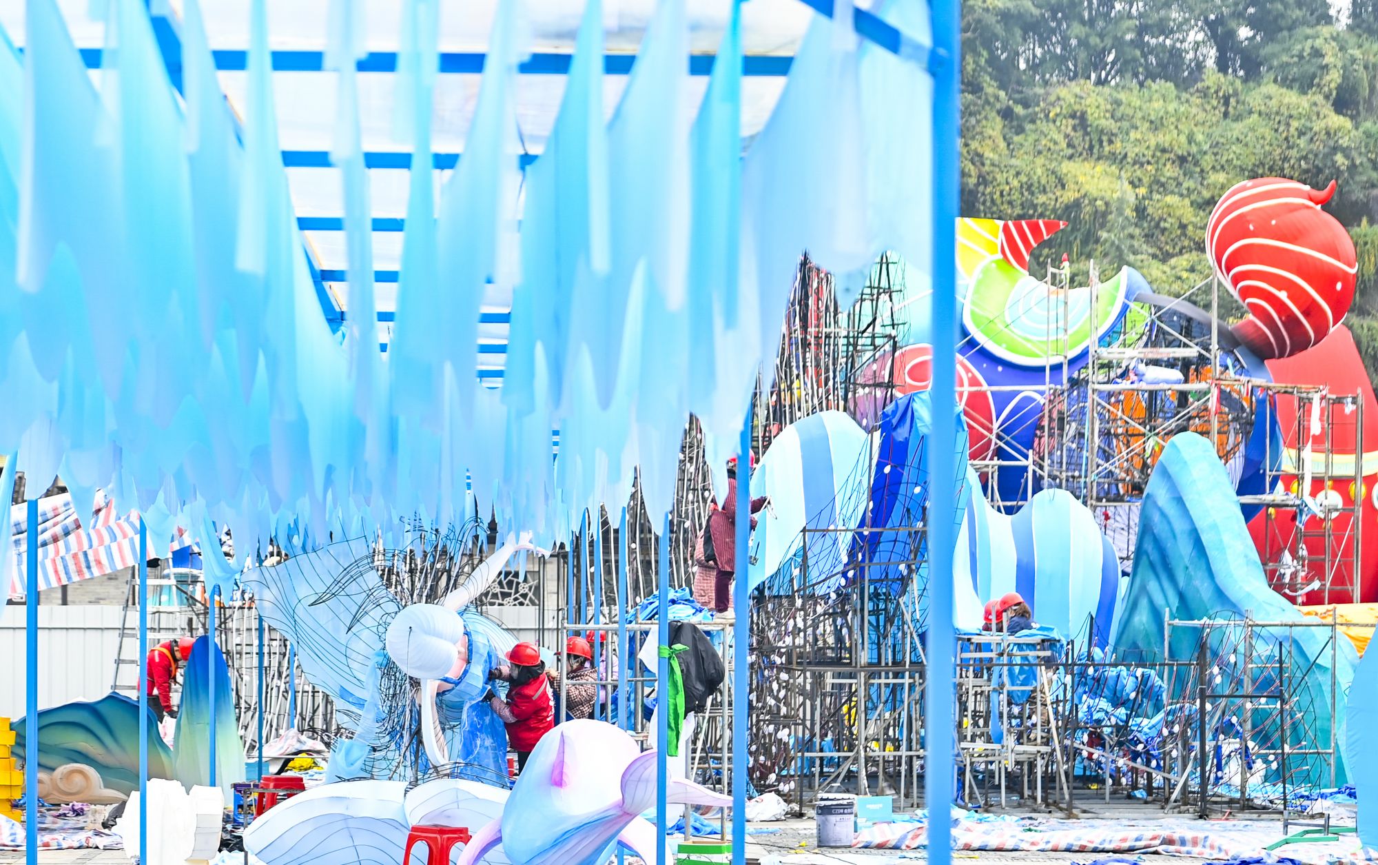 ▲2026重庆市新春灯会——“禧欢霓”园博园大型水上灯会现场,工人正加紧搭建各种造型的彩灯。记者 齐岚森 摄/视觉重庆